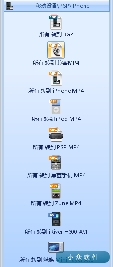 格式工厂支持多种便携移动设备如:iPod,魅族,Blackberry,PSP,iPhone 等的媒体格式转换。